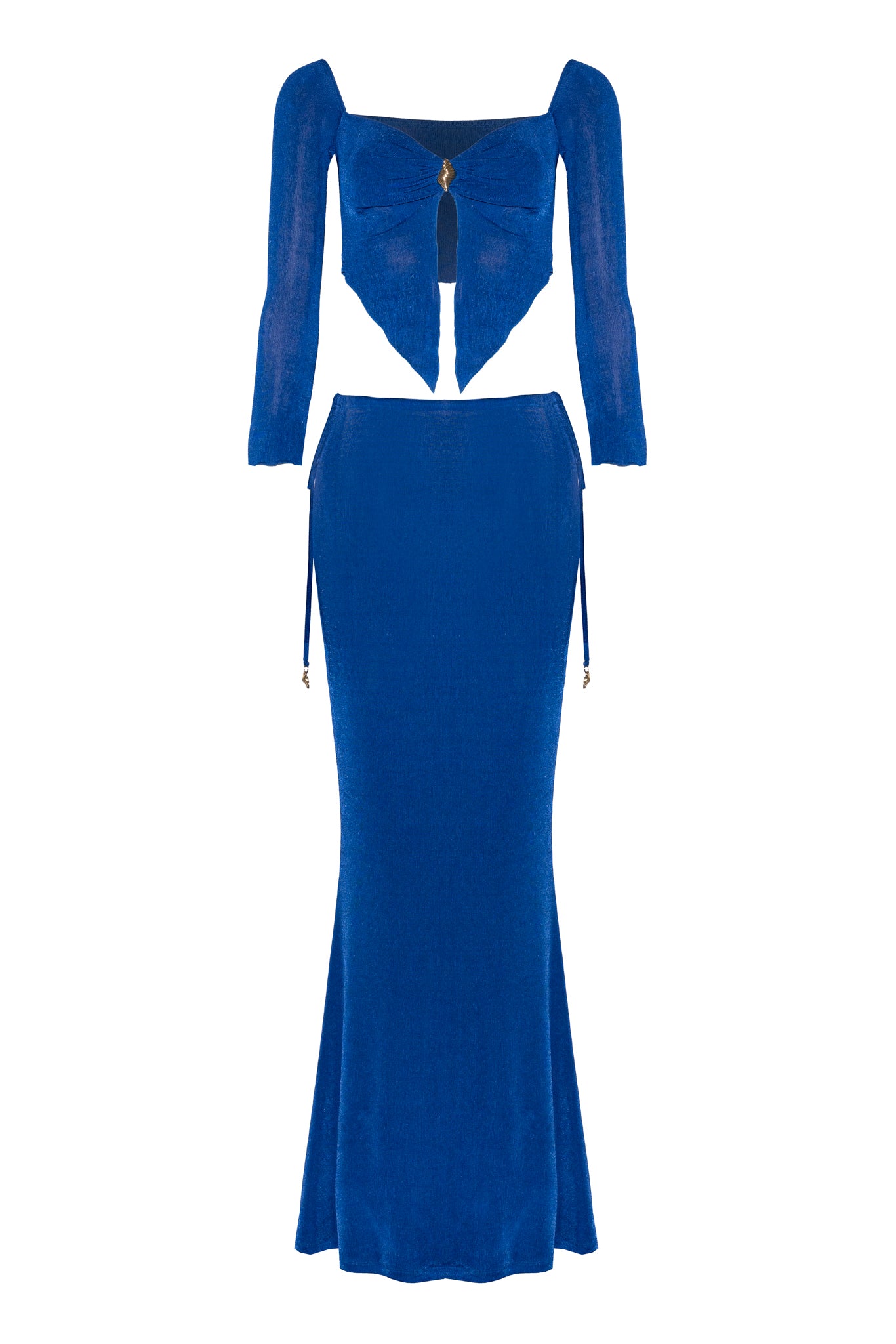 Nasce dalle profondità del mare, toni di sabbia scura e avorio si fondono con un blu elettrico intenso, dando vita a una palette sofisticata e vibrante. Il dettaglio gioiello, una conchiglia dorata, diventa simbolo di una femminilità libera, istintiva, profondamente connessa al mare.